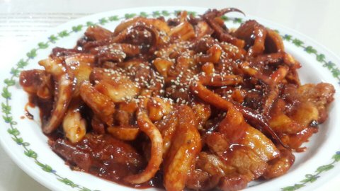 이것은 문어볶음 요리예요. 여자 몸에 문어가 정말 좋다고들 하잖아요. 가끔씩 입맛 없을 때 밥 위에 문어볶음을 올려서 먹으면 밥한공기 뚝딱입니다. 고소하면서도 약간 질긴 식감을 즐기며 ㅋㅋ 아이들도 좋아하는 음식이예요^^ 올리브유와 간장만 넣으면 완성되는 요리!