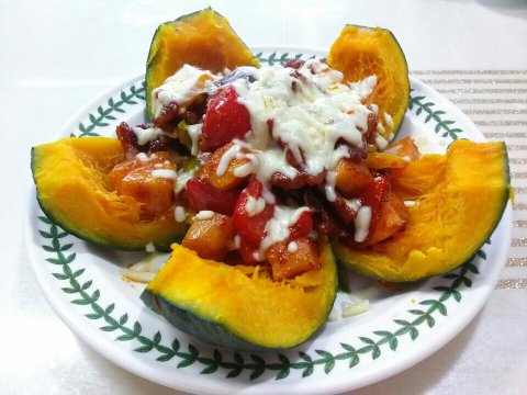 단호박 속 안에 씨 다 빼고, 훈제오리와 파프리카, 양파, 고구마를 넣고 치즈로 마무리! 전자렌지에 2분정도 돌리면 손님들 접대용으로도 좋은 단호박찜이 완성되요.