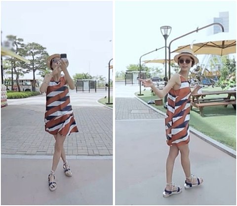 시원한 컬러의 스트라이프 원피스로 바캉스룩 완성한 반면