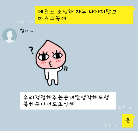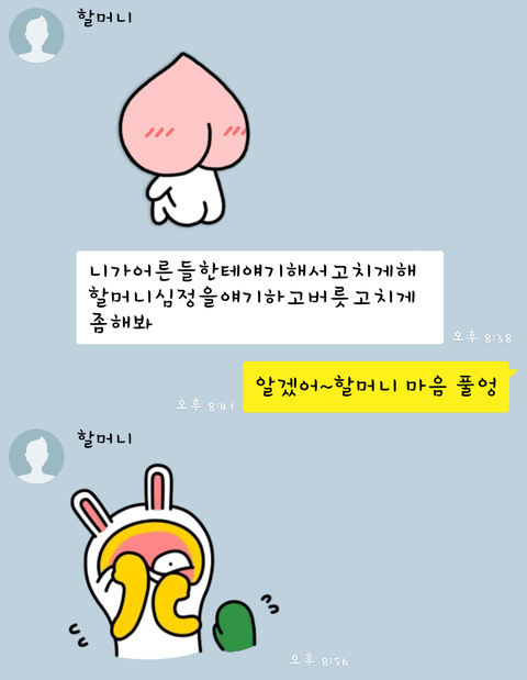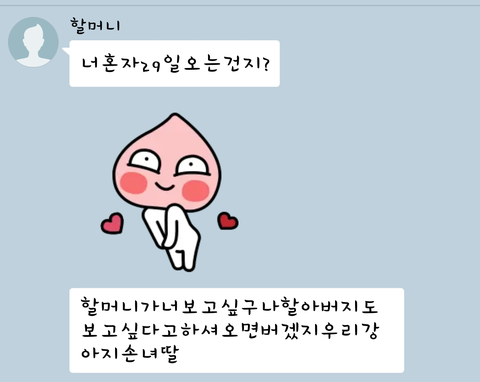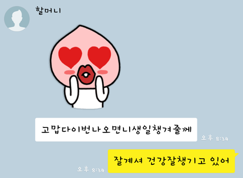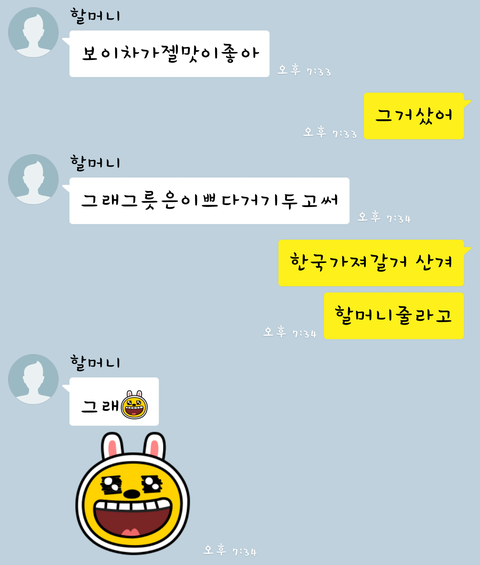 안녕하세요~~저는 이번년도에 졸업하고 바로 유학와서 공부하고있는 평범한 여자사람입니다..ㅋㅋ할머니가 카톡을 하시더니 이모티콘 쓰는법을 알려달라하셔서 알려드렸던 적이 있는데 이제 저보다 잘쓰시네요.♥♥넘 귀여운 우리 할머니 카톡 자랑해요..ㅋㅋㅋ보고싶어요ㅠㅠ혼자 타지에서 지내니까 가족이 얼마나 소중한지 알게되네요.ㅎㅎ