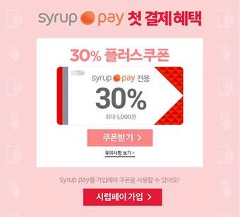 현재 시럽페이에서는 신규 가입 후 최초 결제 시 30% 할인 쿠폰과