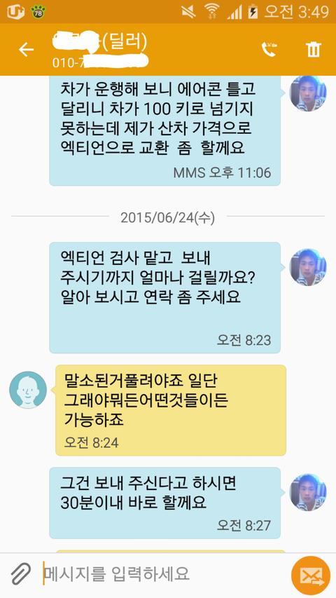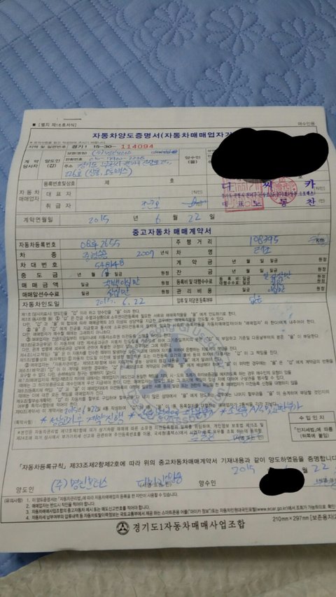 아무리 많이 쳐야 400 안넘는 차량을 630 주고계좌이체로 (620 현금 10만 )줌 (계약서엔 620만원으로 적혀 있네요)등록비 70 만원을 달라고 해서 줬더니 이전비 알선비 관리비용으로 적혀 있네요 (영수증도 안줌)제일 중요한건 차가 속력이 120키로 겨우 넘긴다는 사실 입니다 (이렇게 저 처럼 차를 처음사고 어플 엔카 광고 보시고차 사려고 하는분들은 발품 파시는게 최고라고 알려 드립니다) 제 담당 딜러 정신빼는 방법은 자동차 매장을 빙빙 돕니다 그담 이리저리 간볼 차들을 보여 주면서 가격을 떠 봅니다 그담 정신적으로 육체적으로 지쳤다 보이면 저녁 마감 시간쯤에 작업차를 보여 주고 차를 팝니다. 본론으로 다시 가서..