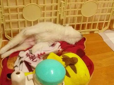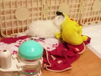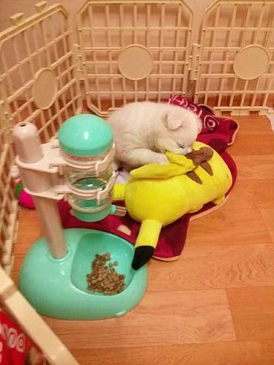 충주에서 서울까지 오느라 힘들었는지 임시로 마련해준 집에서 삐카츄인형을 베고 잠들었어요