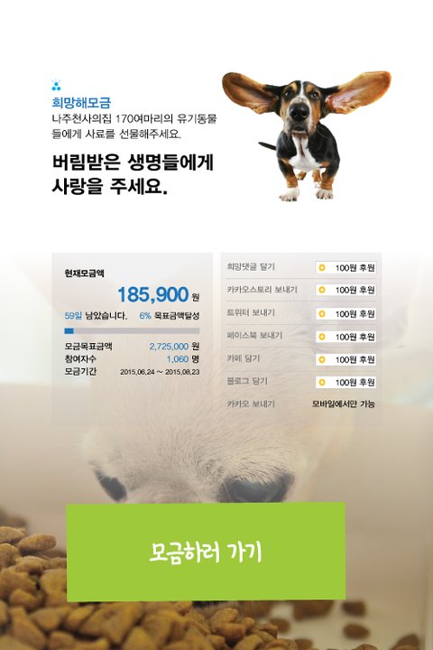 카페, 블로그, 트위터, 페이스북, 카카오톡에 보내기만 해도 100원이 추가로 후원됩니다.