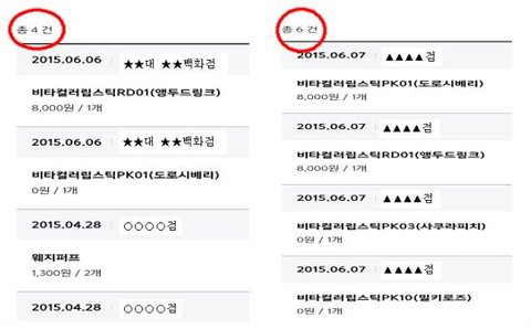 제가 글을 올리고 나서 스킨푸드 구매내역 조회를 했는데 정말 놀랐습니다. 저는 ○○○○점에서 비타컬러립스틱 라이브핑크를 구매했고, ★★대 ★★백화점에서 비타컬러립스틱 앵두드링크, 도로시베리를 구매했고, ▲▲▲▲점에서 비타컬러립스틱 앵두드링크, 도로시베리, 밀키로즈, 사쿠라피치를 구매했습니다. ○○○○점에서 구매한 내역은 친구 이름으로 구매내역을 등록해서 제 내역에 없는 게 맞습니다. ★★대 ★★백화점에서 구매한 내역은 확인할 수 있었습니다. 그런데 ▲▲▲▲점에서 구매한 내역만 빠져있었습니다. 그걸 빌미로 해당 직원이 제 동생에게 ★★대 ★★백화점에서 구매한 앵두, 도로시를 왜 여기에 와서 환불하려고 하느냐고 소리를 질렀을 겁니다. 그런데 정말 이상한 점은 제가 한 달에 10~20만원씩 화장품을 구매하는데 3,000원짜리 아이브로우 하나를 사거나 2,000원짜리 퍼프 하나를 사도 구매내역을 남기는 사람이라는 겁니다. 구매 당시 분명히 직원(매니저 말고 다른 직원)에게 제 전화번호를 불러줬고, 직원이 제 이름까지 확인을 했는데 구매내역에는 조회가 안 됐습니다.