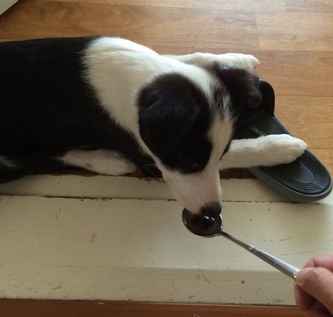 열심히 슬리퍼 물어뜯다가 영양제 숟가락 대주면