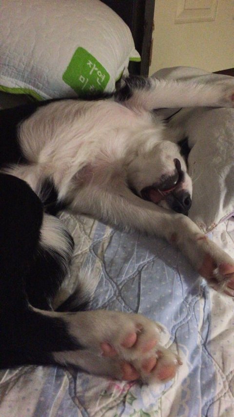 코도 골고, 잠꼬대도 하고, 뭔 꿈을 꾸는지(짐작은 가지만;;;) 네 발을 열심히 휘저으며 자기도 함.