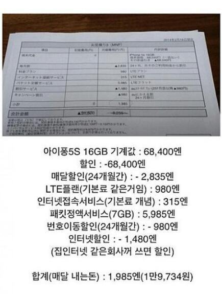 ?? 나도 일본살고 아이폰5s쓰지만 24개월 할부금액 합해서 매달 대략 만-만이천엔 정도 나온다(10-12만원정도) 참고로 도코모. 저건 어디 통신사인진 모르겠지만 솔직히 믿기 어려움;; 일본이 한국보다 통신비 훨비쌈 인터넷도 그렇고