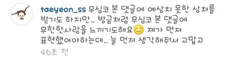 아까 '친한친구 없는 태연'글 보고 가져 옴 자기 가수가 욕 먹고 있을 땐 죽어라 쉴드 해 주면서 악플 금지 이러면서 막상 남의 가수는 절때 존중 안 해주는 ㅠㅠ