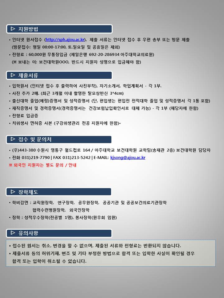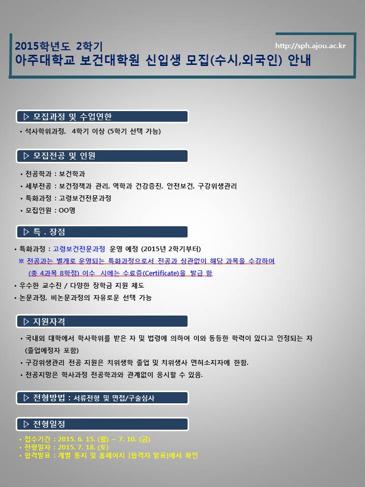 <P style="LINE-HEIGHT: 2" align=center><SPAN style="FONT-SIZE: 11pt">이번 아주대 보건대학원의 2학기 수시 모집요강을 참고하세요</SPAN></P>