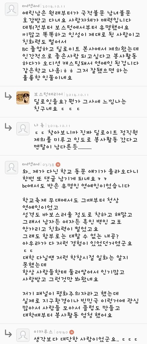 에릭남은 후기나 같이 일한 사람들한테 들려오는 미담이 많은 연예인인데