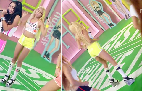 쇼 음악중심에서 레몬색 핫팬츠에 핫한 스트라이프 샌들 신었는데