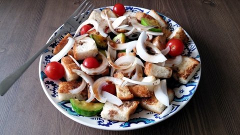 쉽게 말해 양파, 토마토, 올리브등의 채소에 식빵이랑 발사믹드레싱 뿌렸다고 생각하시면 돼요~