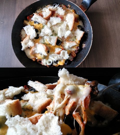 피자도우대신 양파를 깔고 위에 바삭하게 익힌 식빵을 찢어 올려서 후라이팬째로 떠먹는 요리에요. 도우와 토핑이 뒤집힌 느낌이 특징이에요 ㅋㅋㅋ