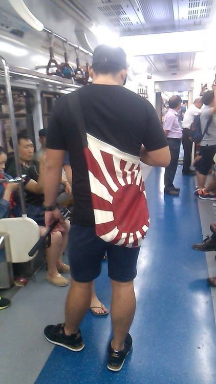 욱일승천기(전범기) 가방 매고 지하철에 탄 남자