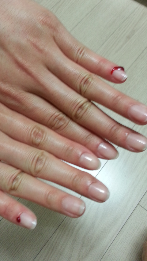 여러번 받았어도 이렇게 피 난적도 없었고 그렇게 힘차게 큐티클 제거랑 손톱갈을때 날려차기 하듯이 한 경우는 처음...게다가 직원도 아니고 사장이신분이.....