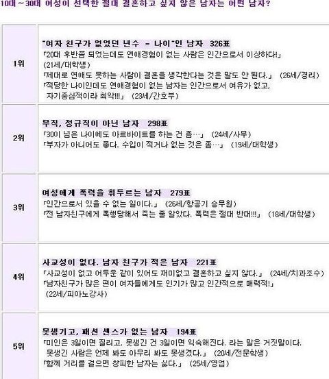 흔한 한국녀들이 응답한 이런남자와는 절대 결혼 안한다 BEST5