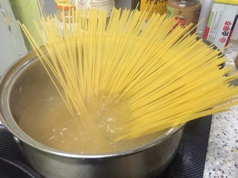 한 달전에 사놓은 파스타면 남은 거를 보글보글 삶아 줌