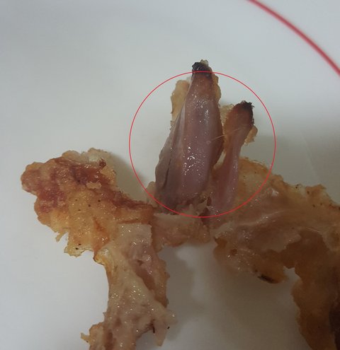 원래 닭튀김은 살에 따라 다르게 튀겨질수도 있다. 닭살이 빨간색이니까 튀겨도 빨간색이다. 라고 하셨답니다.