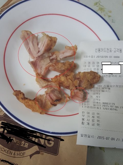후라이드 치킨 순살과 소주한병을 시키셨는데, 치킨이 안익어서 나왔다고 합니다.