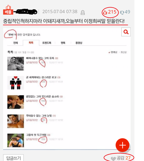 제가 게이라는 느닷없는 댓글이 달리자 이거다 싶은 까페 회원님들, 바로 신나게 추천하고 제가 밑줄 쳐 놓은 저런 대댓글들을 신났다고 다시더군요. "헐.. 소름.." 이라든지 위에 밑줄 쳐놓은"과연 핫바라는 아이디를 쓰는 사람이 얼마나 될까.." 등. 바로 이게 정확하게 여러분들이 이정희 사건에 대해 하고들 있으신 행동들 입니다. 저런 확실하지도 않은 근거를 앞세워 이사람 게이다! 하니까 그 근거없는 말들을 100프로 믿고 추측을 해서 단정을 짓고 딴사람을 폄회 하고 비난 하기 시작하죠. 똑같습니다 현재 이정희씨 상황이랑. 안에서 새는 바가지 밖에서도 샌다고.. 축하 드립니다. 당신들은 이로 인해 원래 이렇게 행동하는 그룹이라는 것을 완벽하게 증명 하셨습니다. ㅎㅎ
