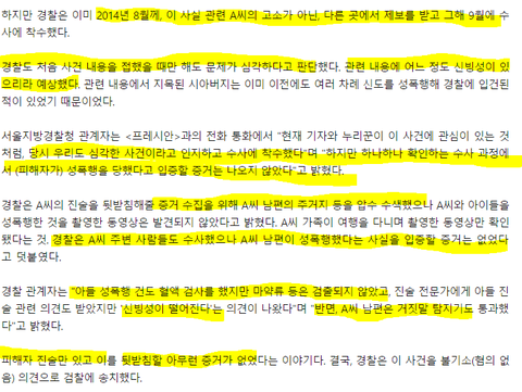 이건 비단 언론만 해당되는 이야기가 아닙니다. 경찰 입장도 똑같습니다. 혈세를 써서 이미 압수수색, 피검사, 거짓말 탐지기, 주변사람들 조사 등등 할수 있는건 다 탈탈 털어봤는데도 나오는건 없었습니다. 당신이 경찰이라면 어떻게 하고 싶으십니까? '아 이 아줌마 또 이러네. 이미1년전에 무혐의로 끝난걸 또 들고 일어나면 어쩌라고' 라고 생각하지 않으시겠습니까? 저라면 그러겠습니다.