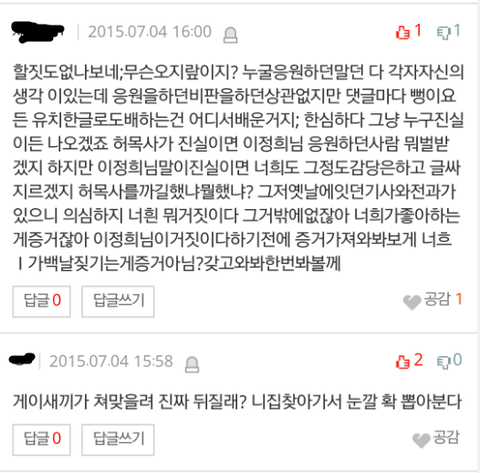 제가 오지랖 부린다구요? 솔직히 당신들의 논리 대로라면 진심으로 오지랖 부리고 있는 사람은 제가 아니라 바로 당신들 입니다. 당신들의 논리대로라면 당신들 일 아닌데 뭐하러 나서나요? 나만 아니면 되는거? 어짜피 누가 진실로 밝혀지든, 누가 자살을 하던, 누가 구속이 되든 당신들은 내일 아니니까 "아몰랑~" 할거지 않습니까? 제가 이렇게 까지 하는 이유는 아무런 근거 없는 글들을 맹신해 애먼 사람이 피해받지 않았으면 하는 마음에서 쓰는겁니다. 오지랖이 아니고 님들을 가르치려 드는것도 아닙니다. 응원 할려는 사람들 왜 비난하냐구요? 당신들이 단순히 응원만 했나요? 아무런 근거와 증거 없는 글들을 세계 이곳저곳으로 퍼나르며 남들을 선동하고 한 나라를 개망신 주지 않았나요? 그리고 또한 조금이라도 이정희씨에게 의구심을 가지는 자를 성폭행범으로 치부해버리고 알바라고 하고 나중에 자식 낳으면 똑같이 당하라고 저주를 퍼붓는등, 상스런운 언행을 저질러서 상처를 주지 않았나요?