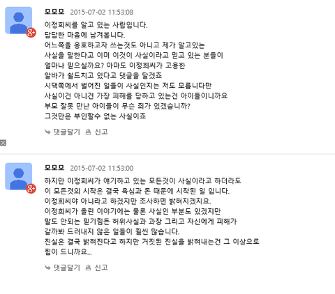 더이상 글은 추가 하진 않겠지만 증언들이 추가로 보이면 (물론 허무맹랑한 소리 같은것들은 안올립니다) 올리겠습니다. 보시면 알겠지만 "재산싸움이다" 라든지 이런 증언들이 있습니다. 그리고 날짜를 보시면 알겠지만 그 증언들도 이미 이 이정희 사건 초반에 나온 것들 입니다.