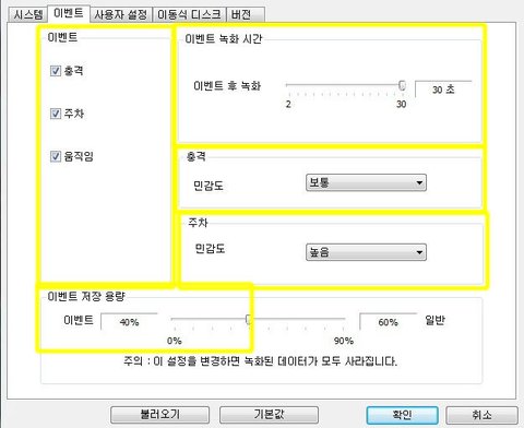 충격 민감도는 주행과 주차의 공통적용으로 3단계의 설정값으로 구성이 되어 있으며,