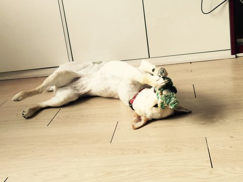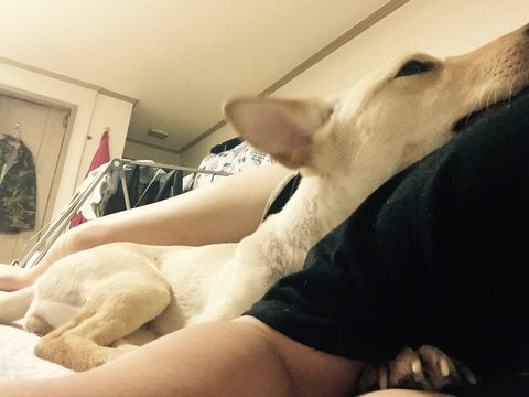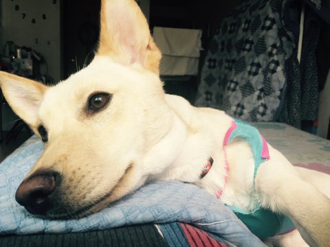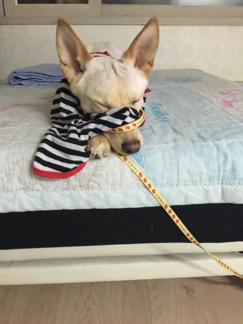 청소 하느라 묶어 놨더니 지 옷 물어뜯다 저러고 잠듬