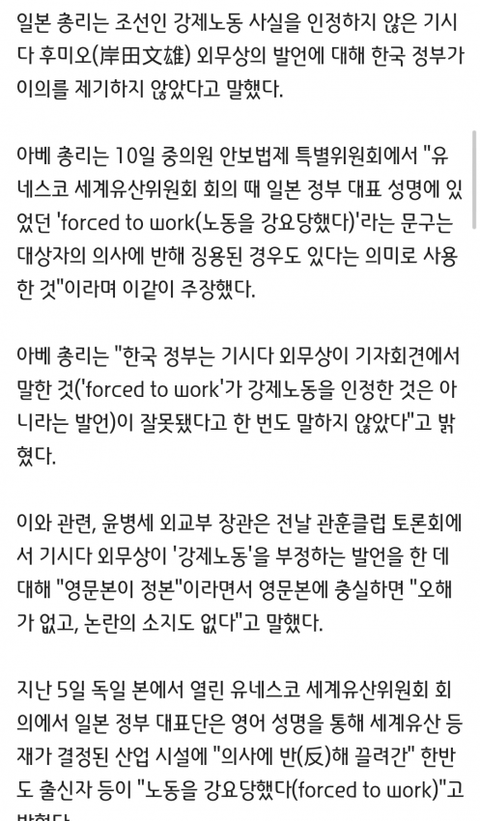 아베 "한국은 우리가 강제노동 아니다 라는 말에 이의제기 안해"불만토로