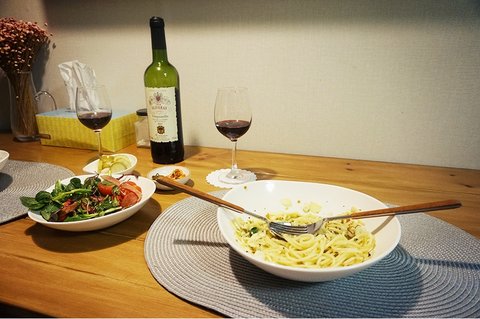 메드포갈릭 갔다가 갈릭피뇨파스타에 뿅가서 집에서 만들어 분위기 내봤어요 ㅎㅎ