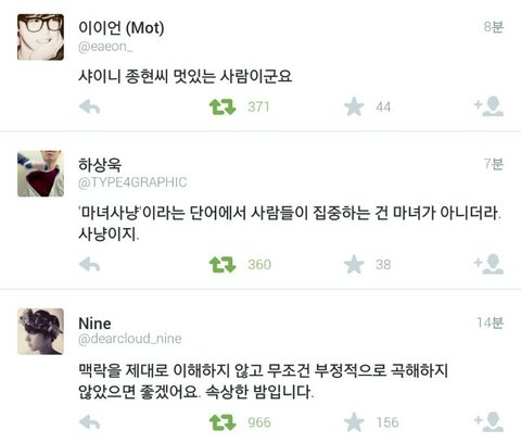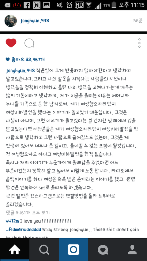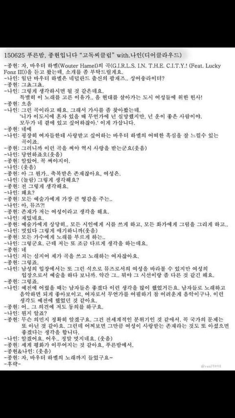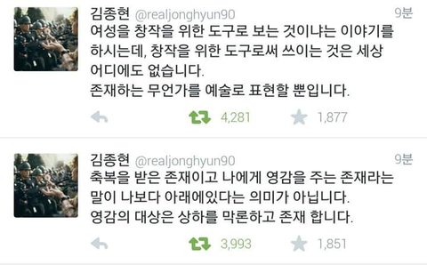 근데 이걸보고 어떤 난독증이 종현이 무슨 여성혐오자네, 여성 비하발언을했네,, 어쩌고저쩌고 떠드는바람에 퍼지고퍼져서 결국 본인 귀에 들어가게됐음; 도대체 저 대화를 어떻게 읽으면 여성 혐오고 여성비하발언인지 난 1도모르겠음;