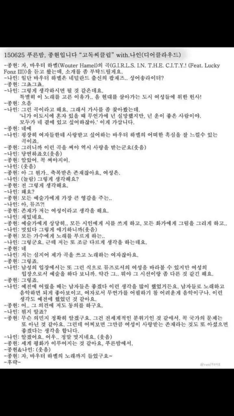 종현이가 원래 이런 일에는 잘 안 나서는데.. 무슨 일이지? 하고 기다려보니, 지난 6월 25일 목요일 푸른밤 코너인 '고독씨 클럽'에서 디어클라우드의 나인씨와 나눈 이야기들이 말도 안되는 짜집기로 여혐이라며 몰리고 있음. 밑 사진은 대화 전문임