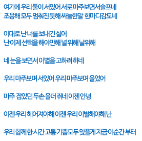 아까 문라이트 가사 좋다고 글 올라오길래쓰는 건데 마주보며 서있어도 너무 예쁜듯 ㅠㅠㅠㅠㅠㅠ뭔가 그 막 헤어지는거 이런거만 빼고 우리 마주보며 서있어 라던지 우리 마주보며 울었어 라던지 이런건인피니트 멤버들 사이간에 노래인 것 같기도하고 인피니트랑 인스피릿 인것도 같고 암튼 수록곡 전부다 취저ㅠㅠㅠㅠㅠㅠㅠㅠㅠ♥