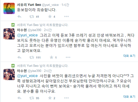 서유리가 다리벌려에 대해 불편한 감정 말하고 박혁거세면 인정 이런 말 하니까 서유리에게 직멘으로 욕함.