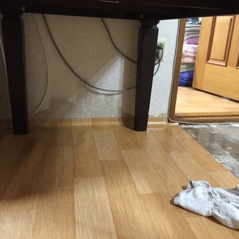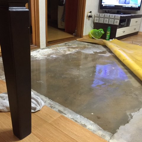 물이 다 새서 거실 한쪽이 아예 한강이 되어 있었음 얼마나 물이 많이 흘러 내렸으면