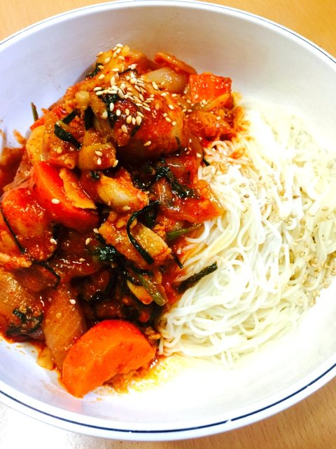 클래식을 두병이나 먹었음에도 1인 1닭을 실천하지 못한죄로 다음날 남은 양념을 박박 긁어서 소면을 비벼 해장을 함으로서 치느님께 사죄를 하였습니다.