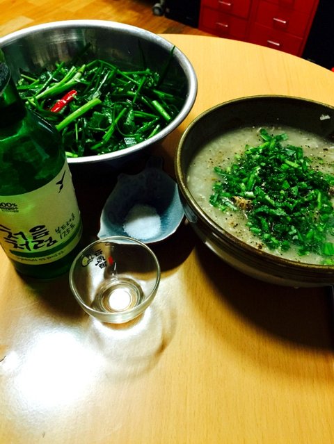 엄나무, 헛개나무와 가시오가피, 황기백숙셋트를 넣고, 찹쌀도 갈아넣고 땅콩도 볶아서 곱게 갈아서 탄산수로 끓인 백숙입니다. 예전에 어디서 땅콩을 갈아 넣는것이 비법이라고 해서 넣었는데 국물도 매우 진해지고 구수합니다. 어김없이 한주의 마무리는 소주와 함께...