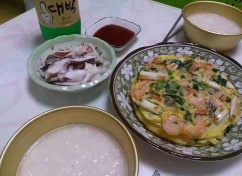 저희는 맥주보단 동동주를 좋아해요 동동주엔 해물파전+남은 오징어로 만든 숙회