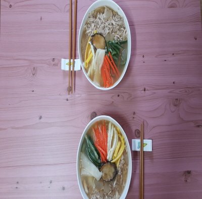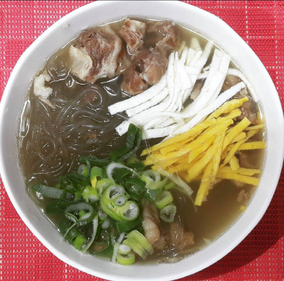 한우 갈비 500그램 사다가 반나절 핏물 빼고 압력솥에 푹 고와서 하루 냉장고에 넣어놓고 기름 굳혀서 기름 싹 걷어내고 국간장 소금 후추 간했어요. 당면 삶아 넣고 지단 부쳐 올리니 그럴싸하쥬~? 맛도 따봉이었어요.