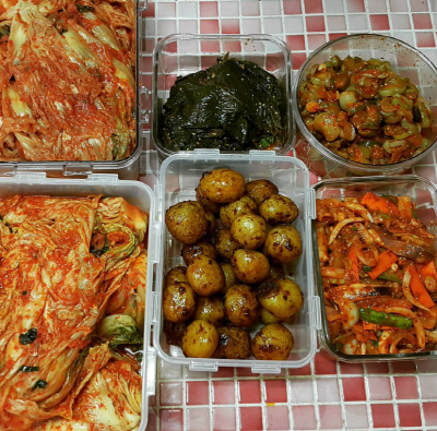 엄마표 밑반찬 : 묵은김치 햇김치 감자조림 오징어초무침 오이지무침 깻잎장아찌.
