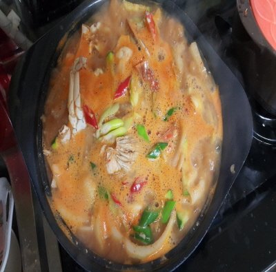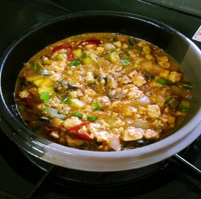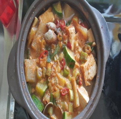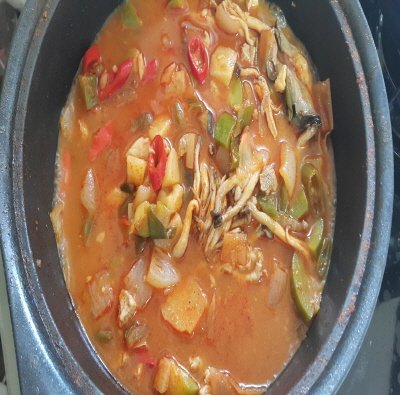 전날 불고기 하려고 사온 버섯이 너무 많이 남아서 냉장고에있는 야채들 털어 넣고 얼큰한 고추장 찌개 했어요. 매콤하니 술을 부르는 찌개!