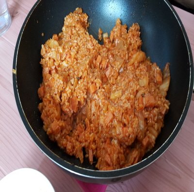 남은밥 처리할때 정말 짱!! 전 색깔을 좀 내기 위해서 고추장을 조금 넣어요. 스팸과 김치는 참 잘 어울리는거 같아요! 대신 나트륨 주의..!!