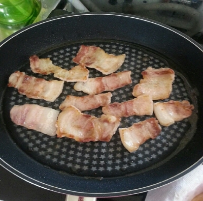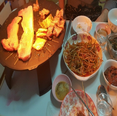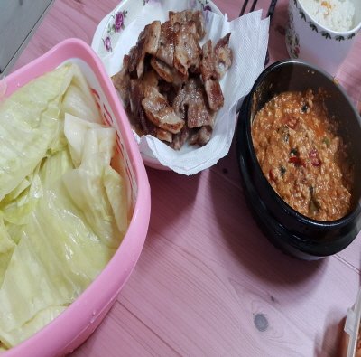 냉동실에 박혀있던 삼겹살 후라이팬에 그냥 굽고 두부 으깨 넣고 각종 야채랑 우렁이 다져서 강된장을 했어요. 엄마표 집된장이라 짜지도 않고 참 맛있었어요.