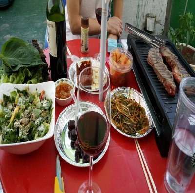 시댁에서 편의점 파라솔과 테이블 의자를 업어왔어요.집 옥상에다가 펴고 분위기좀 잡겠다며 와인도 따고 와인에 돼지고긴 아니지 않냐며 두툼한 살치살도 굽고.근데 ㅠㅠ 와인은 떫고 맛없고 호주산 살치살은 누린네 나고ㅠㅠ막 덥고 ㅠㅠ 한시간도 안 앉아있다 내려왔어요 ㅋㅋㅋㅋㅋ그냥 우린 삼겹살에 소주 먹는 팔잔가보다 하면서요.
