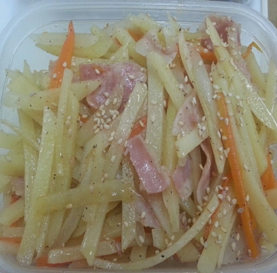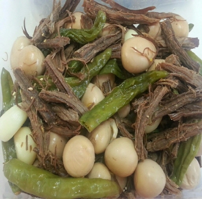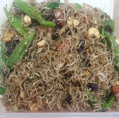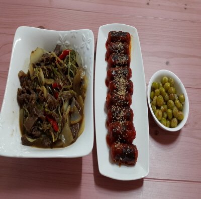 - 소고기장조림, 견과류멸치볶음, 진미채, 오뎅볶음, 베이컨 감자볶음-