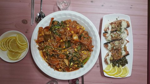 잡채, 오리무쌈말이, 육회, 호박전, 꼬지전, 오징어파강회, 자이글 켜고 한우 갈비살까지~