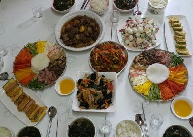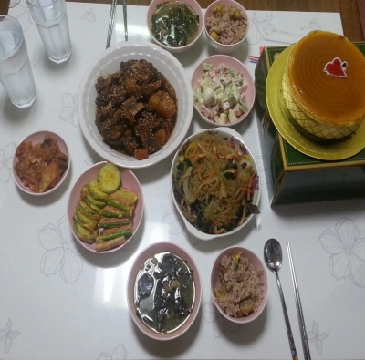 -신랑 생일 상 : 미역국, 갈비찜, 사라다, 구절판, 골뱅이무침, 꼬지전, 호박전, 잡채-