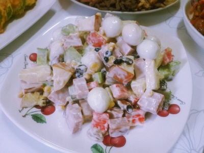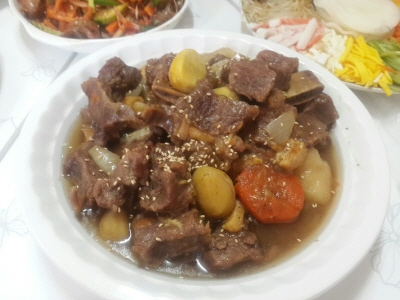 -신랑 작년 생일상 :갈비찜, 사라다, 잡채, 호박전, 꼬지전-